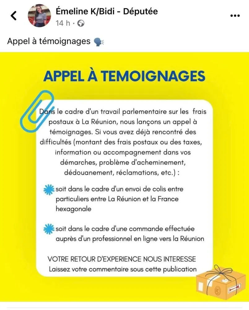 La députée de la 4e circonscription de La Réunion, Emiline K/Bidi lance un appel à témoignages concernant les frais postaux à La Réunion. Ceci, entre, dit-elle, dans le cadre d’un travail parlementaire.