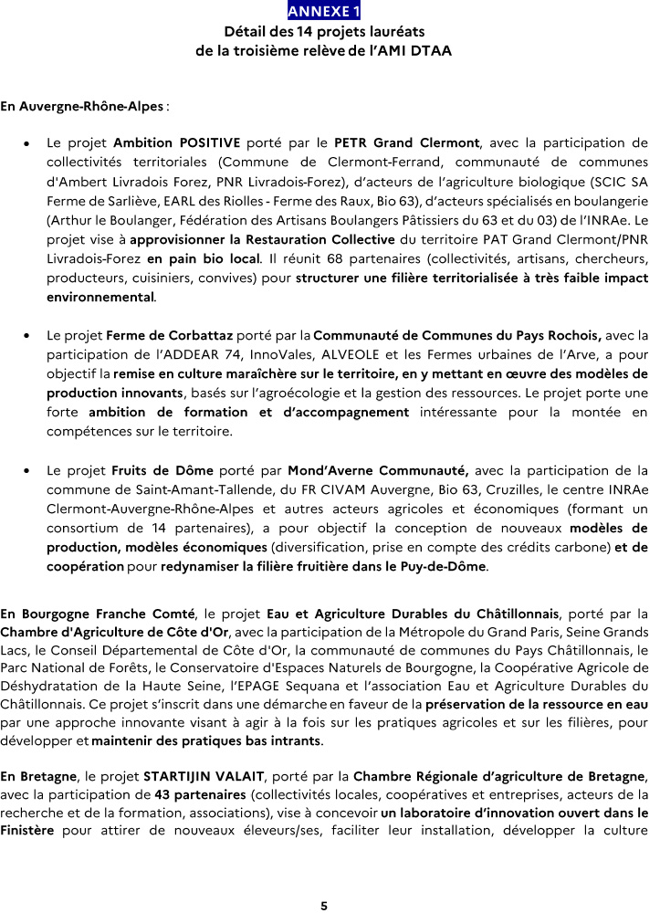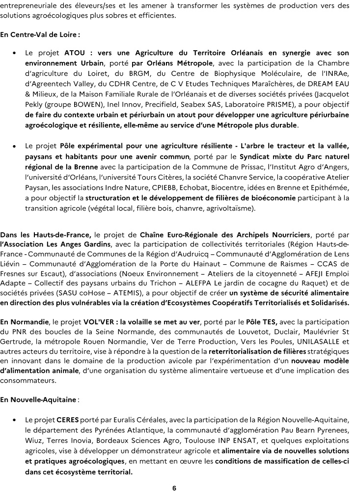 Marc Fesneau, ministre de l’Agriculture et de la Souveraineté alimentaire a déclaré : « Je tiens à féliciter les acteurs qui se sont réunis autour de projets ambitieux pour notre agriculture. Les 14 lauréats que nous annonçons aujourd’hui participent concrètement à construire notre souveraineté alimentaire, territoire par territoire, au service des agriculteurs et des Français. Par leur caractère innovant et réplicable, ces projets permettront de diffuser les bonnes pratiques de filière partout dans notre pays, pour répondre à la diversité des défis auxquels nous devons faire face ».