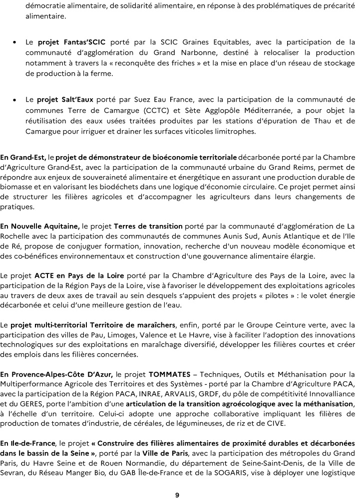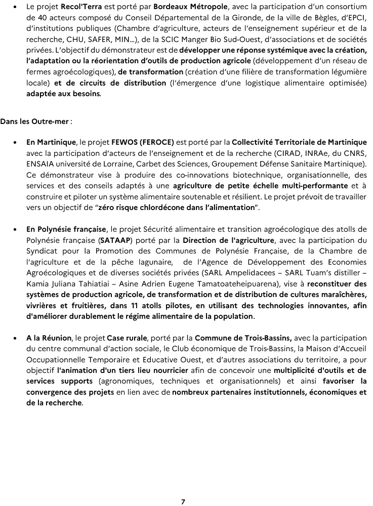 Roland Lescure, ministre délégué chargé de l’Industrie et de l’Energie a déclaré : « Cet appel à manifestation d’intérêt est important. Je souhaite féliciter les lauréats qui ont su structurer des projets territoriaux ambitieux et collectifs, et qui contribueront à accélérer le déploiement de la troisième révolution agricole partout en France, notamment en outre-mer. Ce n’est qu’en déployant sur le territoire des solutions concrètes et opérationnelles que nous parviendrons à renforcer notre souveraineté alimentaire et à améliorer la durabilité et de la compétitivité de nos industries. ».