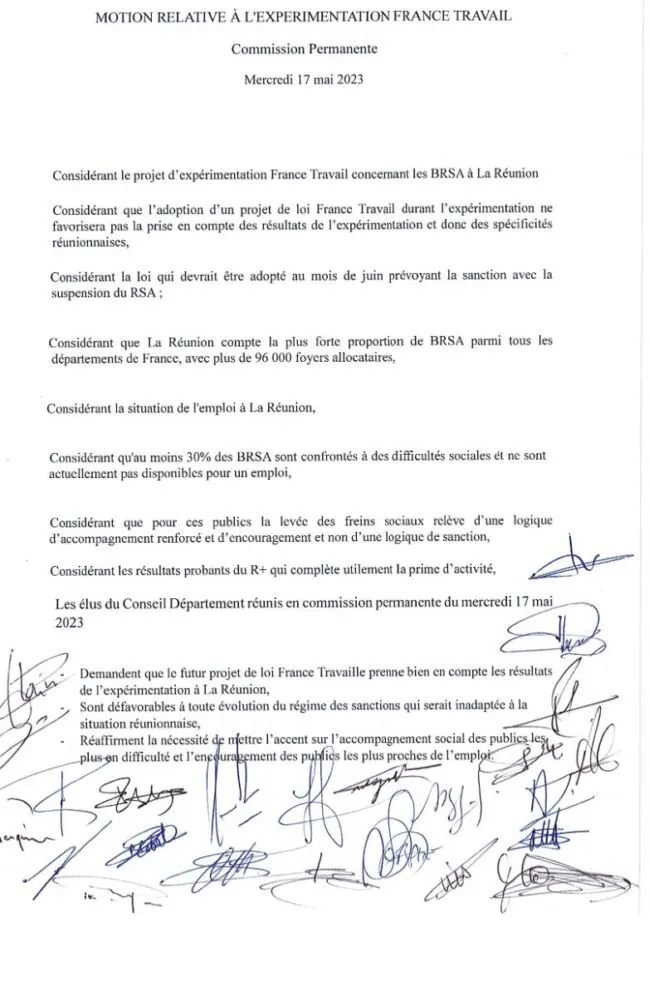A propos de l’expérimentation France travail à la Réunion (le RSA sous contrepartie) , les conseillers départementaux se sont réunis et ont co signé une motion adressée à Matignon pour demander des aménagements.
