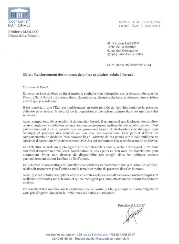 Dans une lettre adressée au préfet de La Réunion, Patrice Latron, le député Frédéric Maillot exprime sa « vive préoccupation » concernant la situation sécuritaire dans le quartier de Fayard à Saint-André. Après des « faits de violence d’une gravité extrême » survenus le 24 décembre, il demande un renforcement urgent des moyens de police et la mobilisation accrue des adultes-relais.
