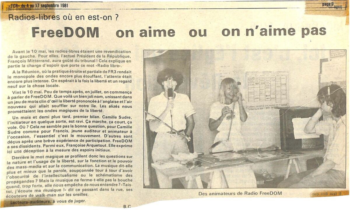 1981 « Free Dom : que voilà un bien joli nom », Brigitte Croisier de Témoignage Chrétien par La Rédaction 17 septembre 1981 1 min de lecture Free Dom : que voilà un bien joli nom, unissant dans un jeu de mots clin d’œil la liberté prononcée à l’anglaise et l’air nouveau qui allait souffler sur notre île. » (Brigitte Croisier de Témoignage chrétien) Ne manquez pas toute l’actualité de La Réunion ! Abonnez-vous à la newsletter de Free Dom ! Valider Partager Facebook Twitter Pinterest Linkedin Whatsapp Reddit Email Vous pourriez être intéressé par 14 janvier 2023 69 migrants sri lankais sont arrivés au Port à 4h30 23 décembre 1981 Lettre ouverte à un commentateur de Radio Free Dom 1 décembre 1981 Radios libres : Noël Caro s’indigne La Rédaction Laisser un commentaire Annuler la réponseYour email address will not be published. Enregistrer mon nom, mon e-mail et mon site dans le navigateur pour mon prochain commentaire. Current ye@r * Leave this field empty Article précédent Sonia arrive à Free Dom en septembre 1981 Article suivant L’incroyable studio de Radio Free Dom dans une cave ! Articles récents... Hommage à Johnny Hallyday sur Free Dom 2 ce 5 décembre Mardi 30 décembre 2025 – Météo, éphéméride et horoscope du jour Saint-Joseph : découverte de 2337 plants de cannabis, arrestation de 2 individus Point sur le réseau routier départemental, 29 décembre à 16H30 Suicide sur le pont de la Rivière d’Abord : importante mobilisation des secours et des forces de l’ordre Radier submergé à Ilet Furcy : la route de Cilaos fermée à la circulation cette nuit Fortes pluies : appel à la plus grande prudence à Saint-Paul Saint-Gilles-les-Bains : une route impraticable, les riverains montent au créneau (VIDEOS) Très grands excès de vitesse : un délit passible de prison depuis le 29 décembre 2025 Fermeture temporaire du sentier de la Canalisation des Orangers (cirque de Mafate)