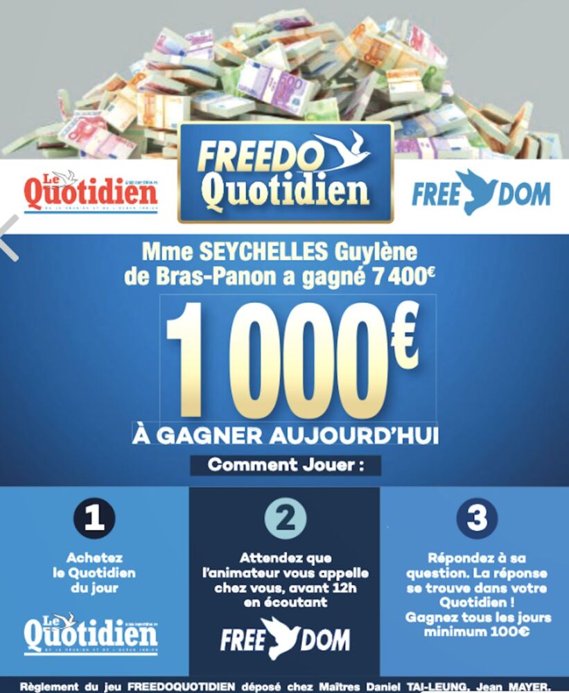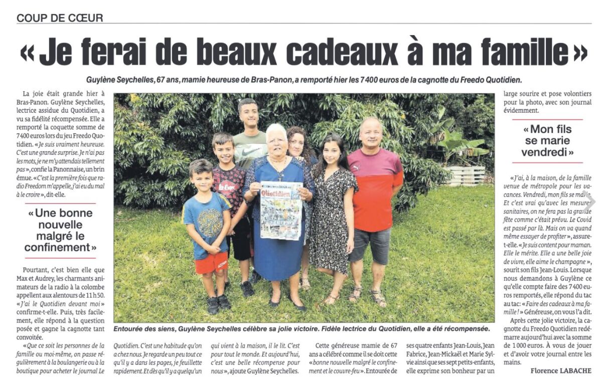 Guylène de Bras-Panon a remporté 7 400 euros ce mardi 3 aout ! »Parfois je prend le journal Le Quotidien, il s’avère qu’aujourd’hui je l’ai fait, et la chance m’a souri, alors merci bien, merci bien !« , dit-elle en direct à Max et Audrey, nos animateurs, heureux de l’avoir fait remporter une pareille somme en plein confinement.
