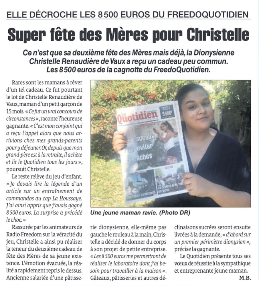 Ayéééééééé !!! C’est Christelle qui a remporté la super cagnotte de 8 500 € le dimanche 30 Mai 2021. En ce dimanche de fête des mères, Christelle, une adorable pâtissière de Saint-Denis, a raflé la jolie somme de 8 500 € grâce à la fidélité de ses grands-parents qui achètent le journal le Quotidien tous les jours ! En arrivant chez eux, Audrey et Francky ont appelé sur son portable de Christelle et grâce à la bonne réponse, elle a remporté la cagnotte du FreedoQuotidien.