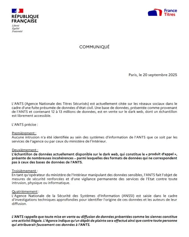 Un communiqué publié le 20 septembre 2025 par l’ANTS (Agence Nationale des Titres Sécurisés) vient répondre aux inquiétudes suscitées par des annonces circulant sur les réseaux sociaux et le dark web. Selon ces publications, une base de données contenant entre 12 et 13 millions d’enregistrements présentés comme issus de l’ANTS serait mise en vente, avec un échantillon accessible librement.