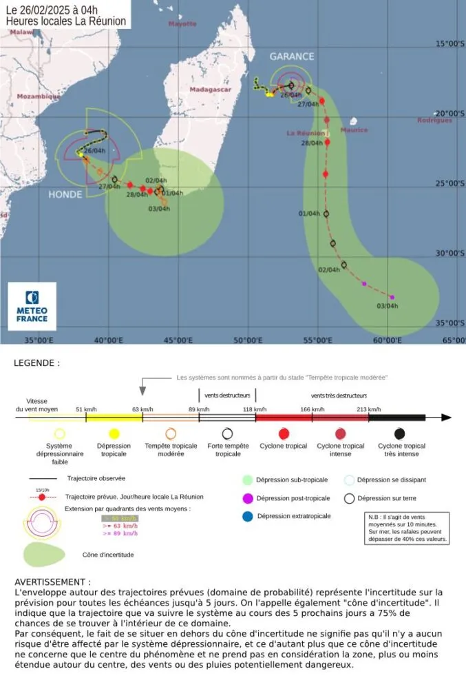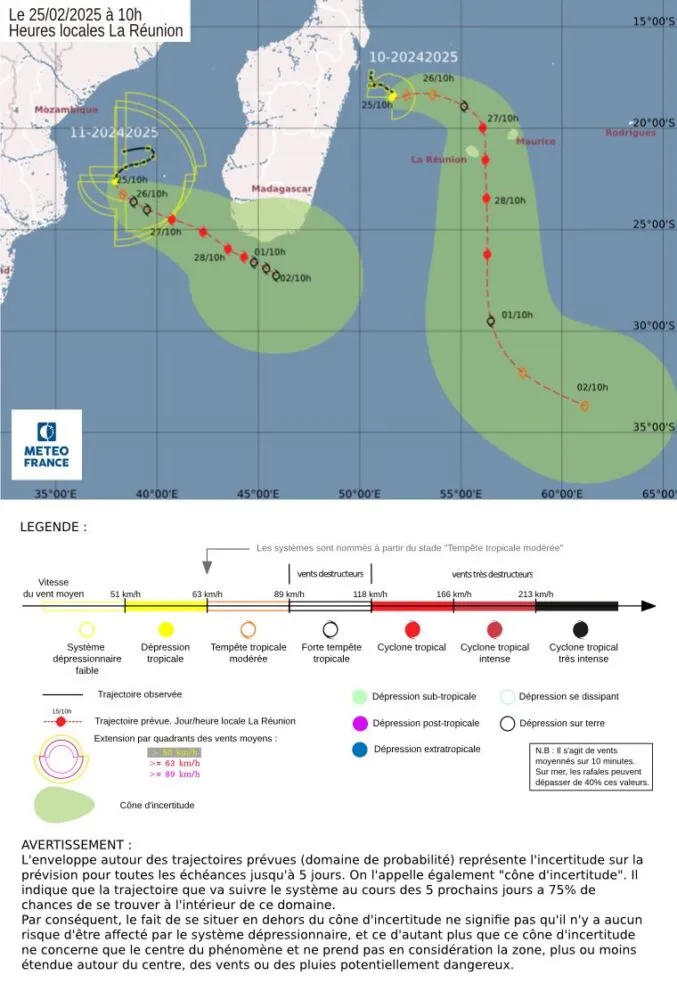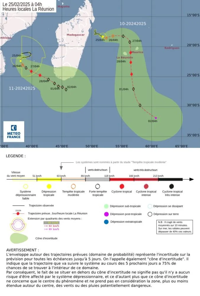 Le système, encore faible, devrait s’intensifier progressivement et atteindre le stade de tempête tropicale d’ici ce soir ou mercredi. À partir de jeudi, il pourrait évoluer en cyclone tropical et se rapprocher du secteur Réunion-Maurice, mais l’incertitude reste importante sur sa trajectoire exacte.