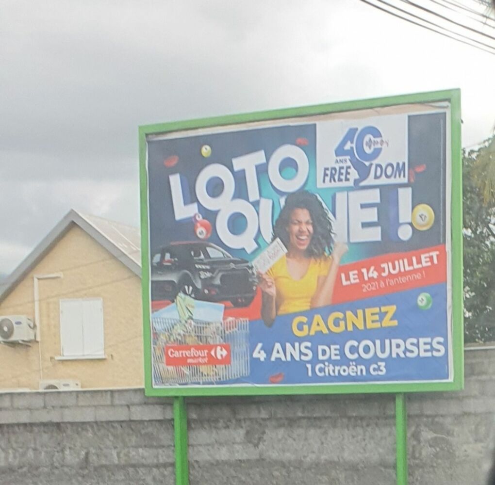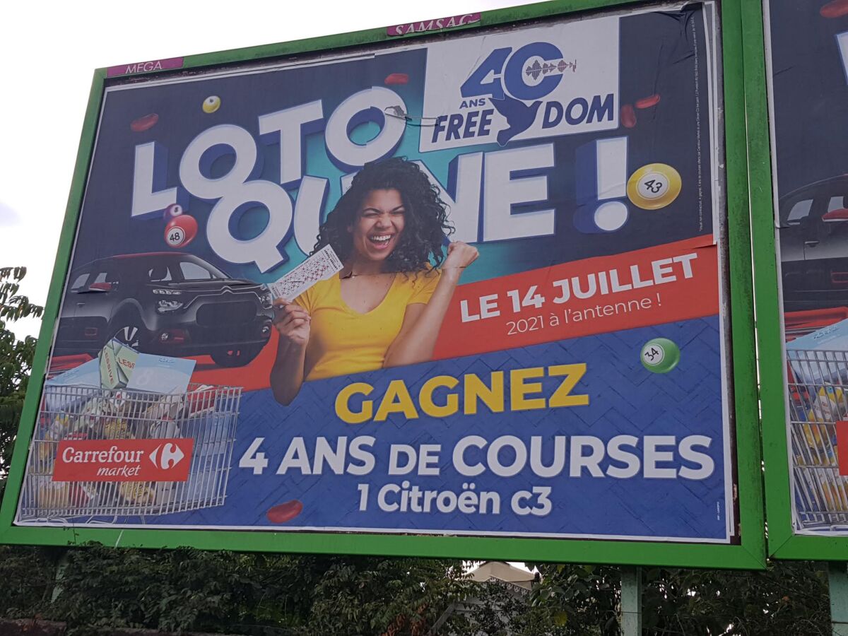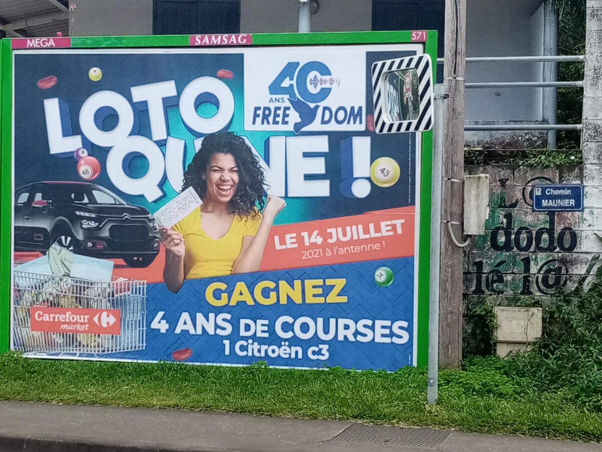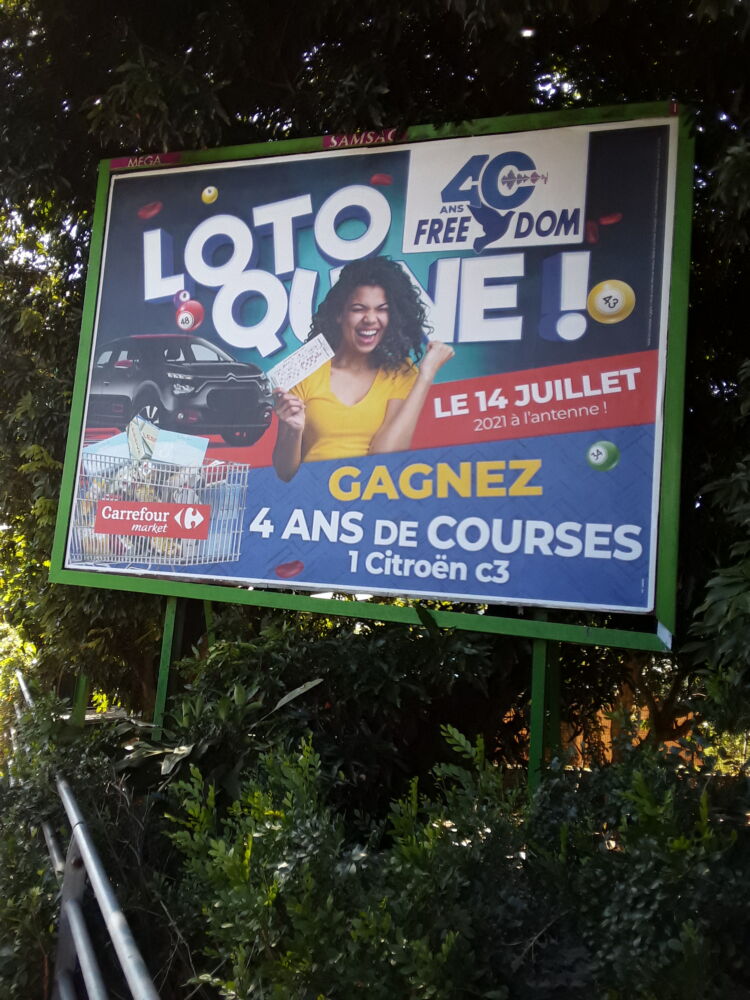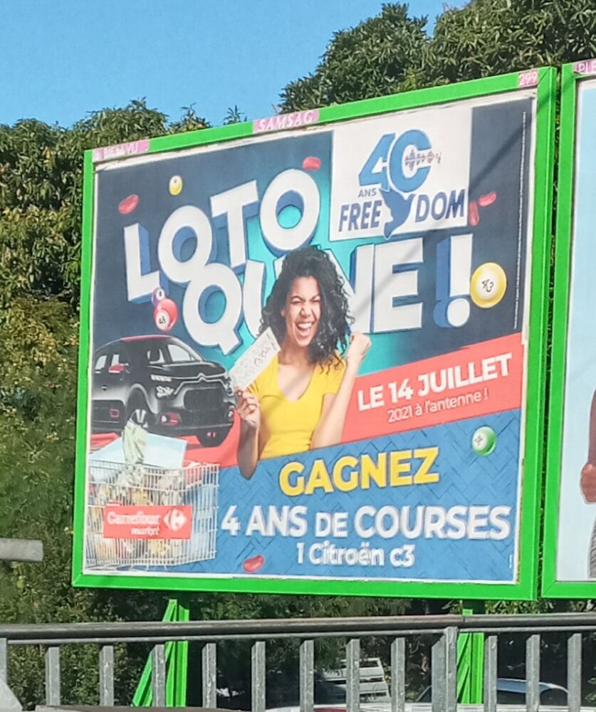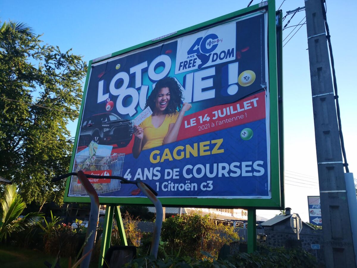 Photographiez les affiches 4×3 du Lotoquine des 40 ans de Free Dom qui fleurissent partout dans l’île et envoyez vos clichés avec la localisation de l’affiche et vos coordonnées postales à web@freedom.fr