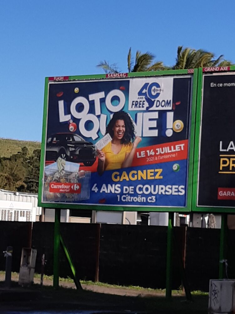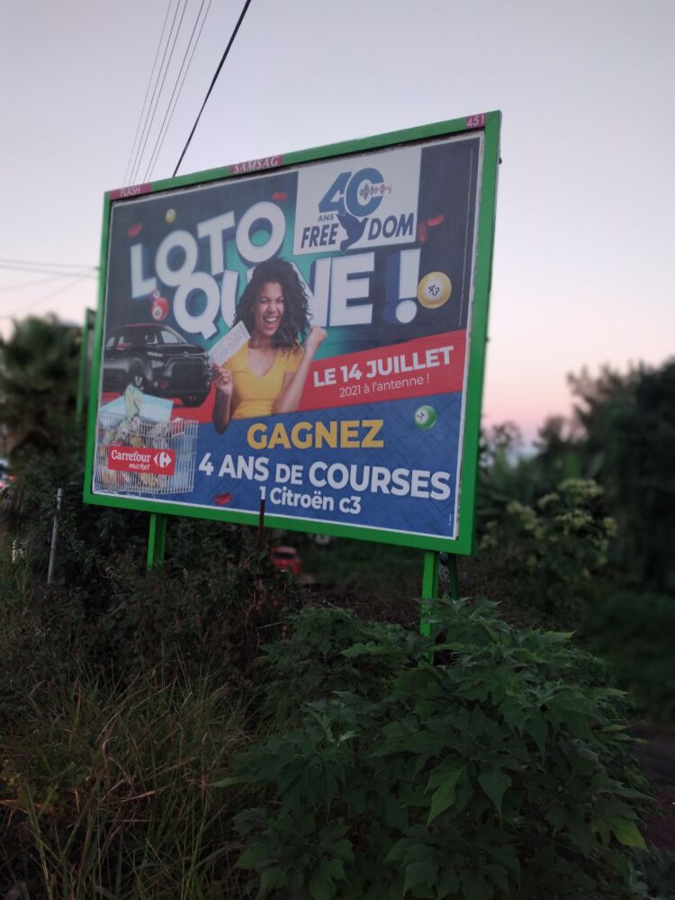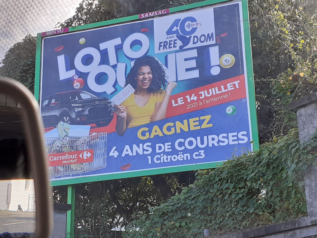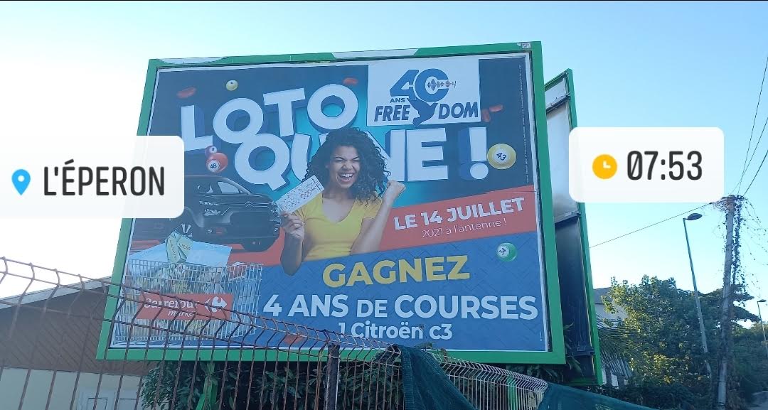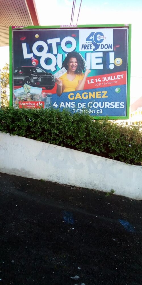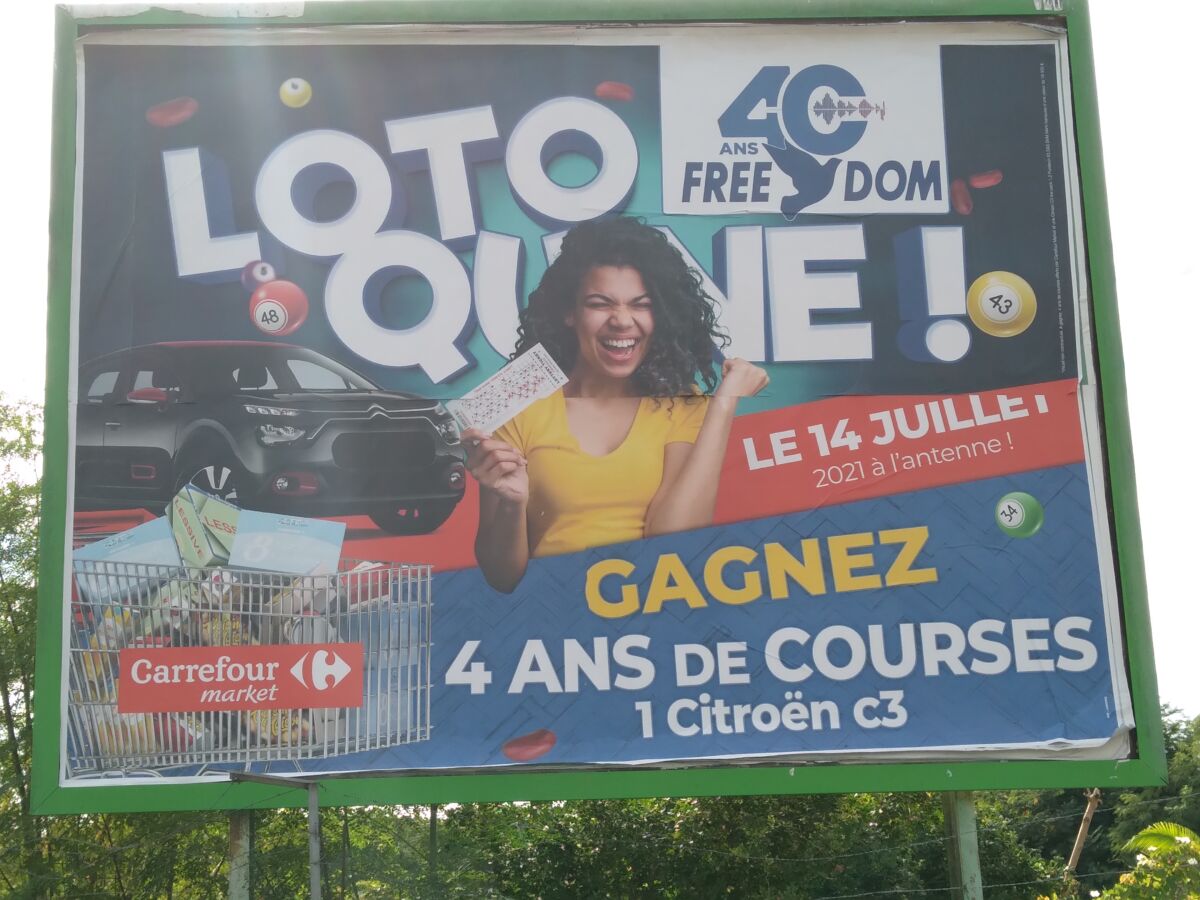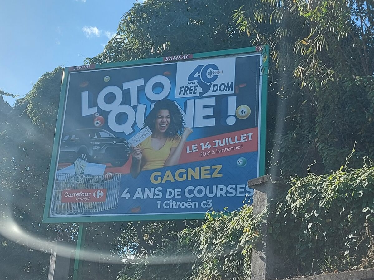 Photographiez les affiches 4×3 du Lotoquine des 40 ans de Free Dom qui fleurissent partout dans l’île et envoyez vos clichés avec la localisation de l’affiche et vos coordonnées postales à web@freedom.fr