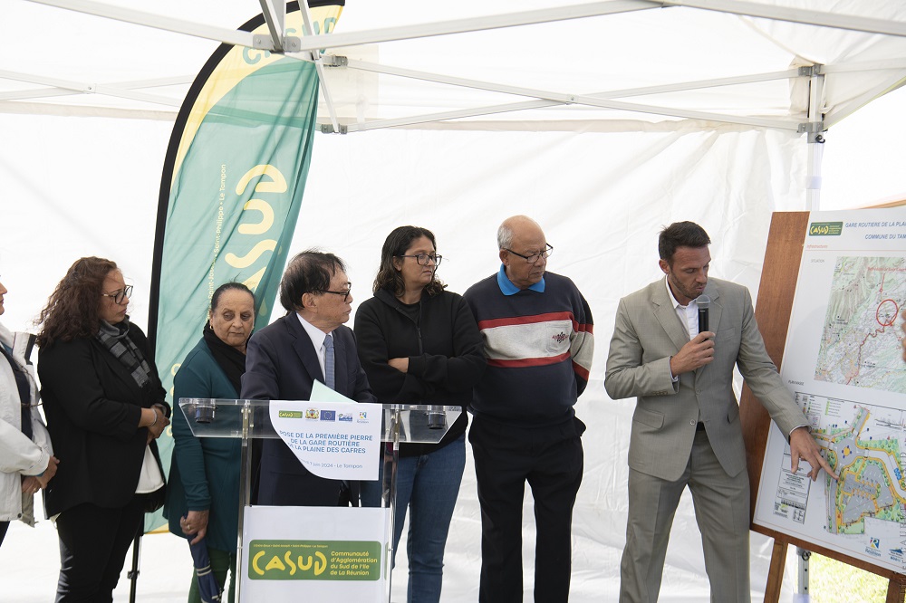 Le Président de la CASUD, André Thien Ah Koon, a posé ce vendredi 7 juin 2024, la 1ere pierre de la future gare routière de la Plaine des Cafres en présence d’élus communautaires et municipaux ainsi qu’en présence de la population de la Plaine des Cafres.