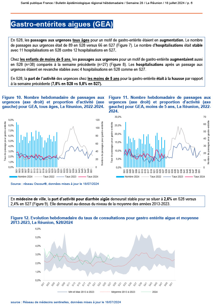 La circulation des infections respiratoires aiguës (IRA) reste modérée, sans impact significatif sur le système hospitalier. Les passages aux urgences pour des gastro-entérites aiguës (GEA) ont augmenté, avec 89 cas rapportés contre 66 la semaine précédente. Cette augmentation est particulièrement notable chez les enfants de moins de 5 ans.
