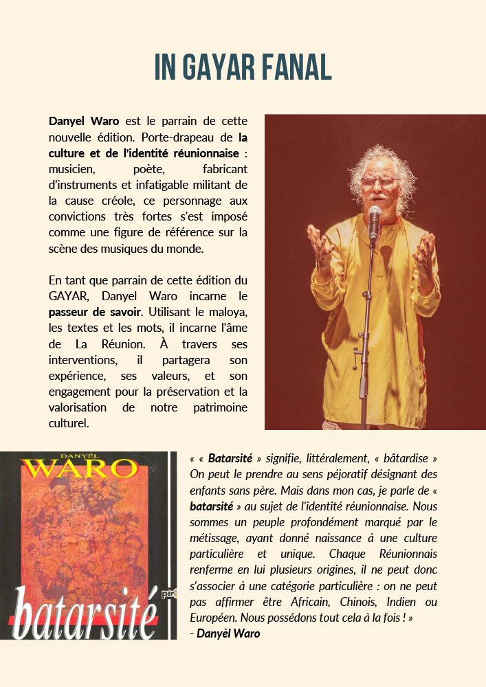 Figure emblématique de la culture créole et du maloya, Danyel Waro incarnera l’âme de La Réunion à travers son engagement pour la préservation de son patrimoine. Fidèle à ses convictions, Waro partagera son expérience et ses valeurs dans un « Ron Kozé » dédié à la « batarsité », ce concept qui résume la diversité et le métissage réunionnais.