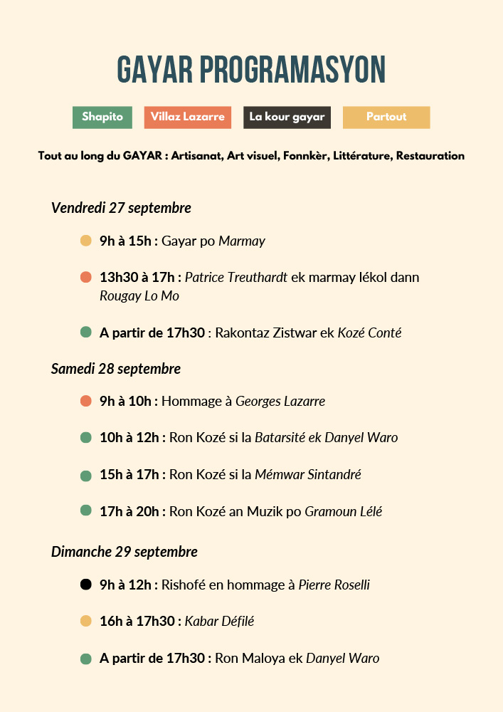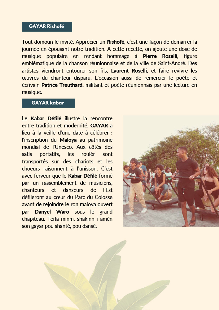 Les trois journées du GAYAR sont rythmées par une programmation éclectique, alliant mémoire et modernité. De l’hommage à Georges Lazarre au Kabar Défilé célébrant le maloya, les festivités s’enchaînent pour offrir des moments inoubliables. Des artistes locaux viendront également honorer des figures emblématiques telles que Pierre Roselli et Gramoun Lélé à travers des hommages musicaux.