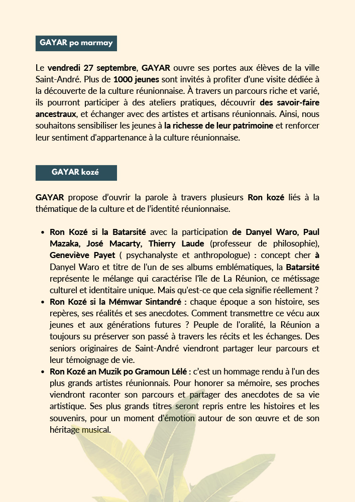 Le GAYAR n’oublie pas les plus jeunes : le 27 septembre, une journée sera entièrement consacrée aux élèves de Saint-André avec des ateliers ludiques pour les sensibiliser à la richesse de leur patrimoine culturel.