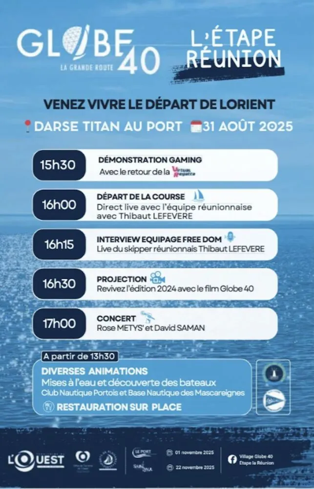À l’occasion du départ de la GLOBE40 depuis Lorient, le Territoire de l’Ouest vous invite ce dimanche 31 août à la Darse Titan – Le Port pour vivre une expérience voile gratuite et inoubliable.