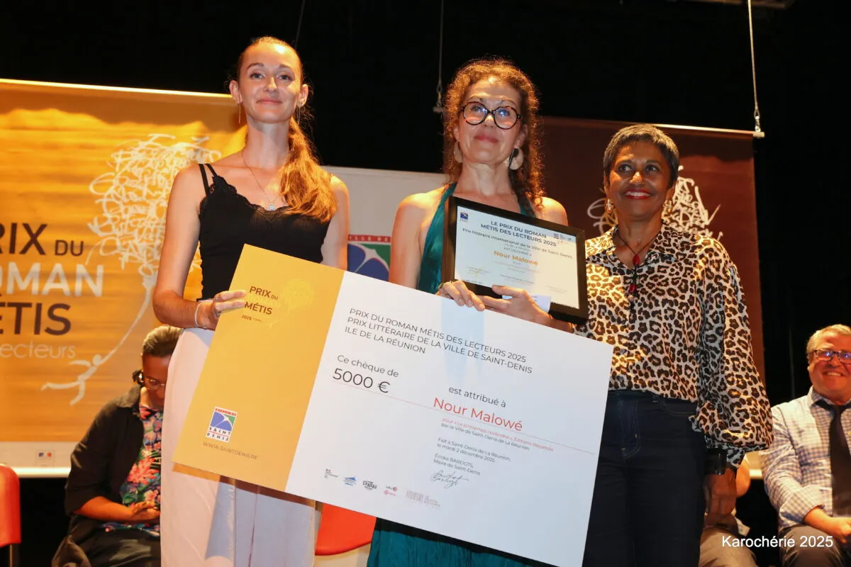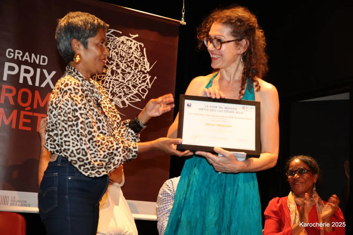 Nour Malowé reçoit des mains de la Maire de Saint-Denis Ericka Bareigts, le prix Roman Métis des Lecteurs de la Ville de Saint-Denis 2025