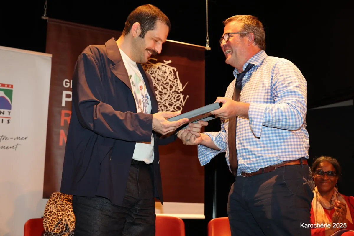 Karim Kattan reçoit son prix des mains de Johnny Malarmé adjoint de la DAC