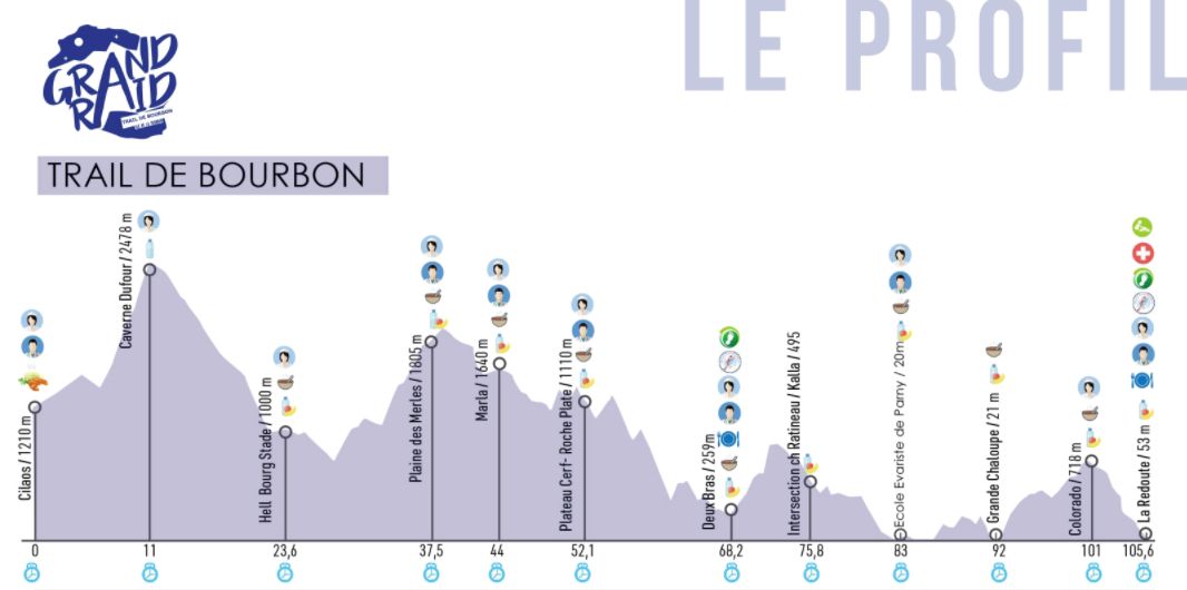 Les participants devront effectuer 105 km et gravir 6140m de dénivelé positif. Le tracé sort du cirque de Cilaos par le Bloc avant de redescendre à Hell-Bourg, au coeur du cirque de Salazie. Les participants rejoindront ensuite le cirque de Mafate. Après avoir escaladé le Maïdo, les traileurs retrouveront la côte et se dirigeront vers l’arrivée au stade de la Redoute.