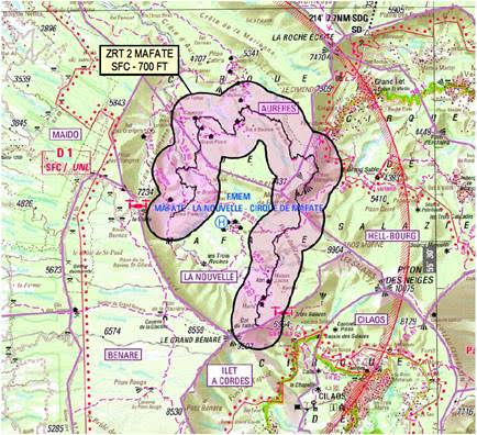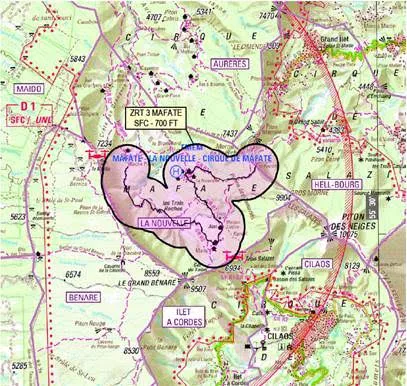 – la zone réglementée temporaire 3 de Mafate qui suit le tracé Trail de Bourbon (à 0,5 NM de part et d’autre) dans Mafate du Col de Fourche (21°04’26.03″S, 055°27’04.68″E) au Maïdo (21°04’25.84″S, 055°23’59.52″E ;