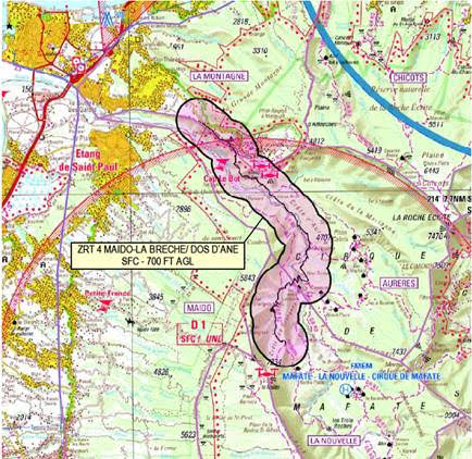 – la zone réglementée temporaire 4 Maïdo-La brèche/Dos d’Âne qui suit le tracé de la Diagonale des fous (à 0,5 NM de part et d’autre) de Maïdo-La brèche (21°03’30.52″S, 055°23’42.66E ») à Dos d’Âne (20°58’21.70″S, 055°21’39.62″E).