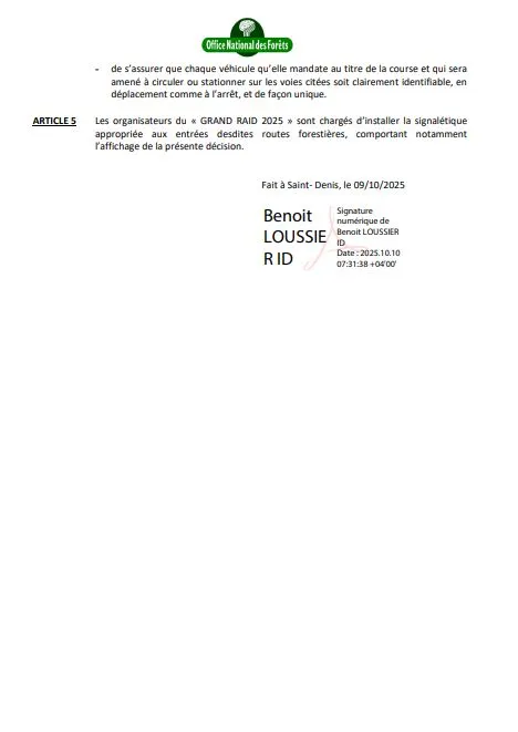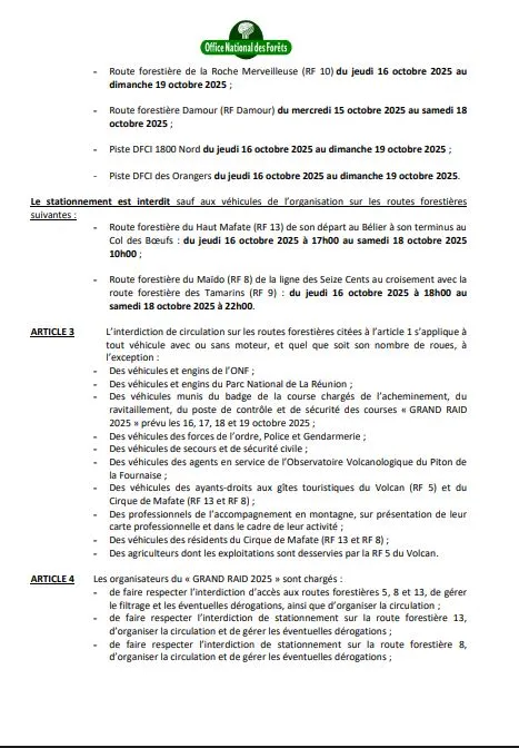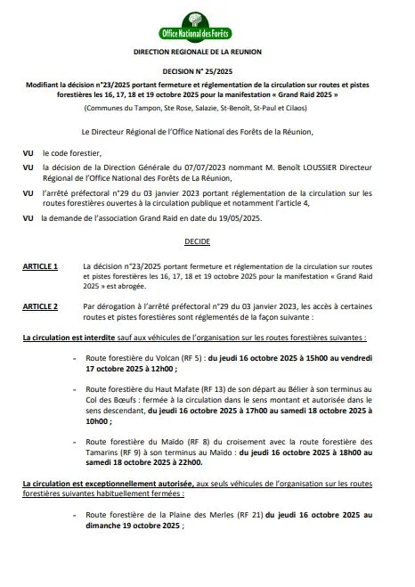 L’Office national des forêts (ONF) informe le public que dans le cadre du Grand Raid, plusieurs fermetures temporaires de routes forestières à La Réunion dans les prochains jours. Ces restrictions visent à garantir la sécurité des usagers et à permettre diverses interventions techniques.