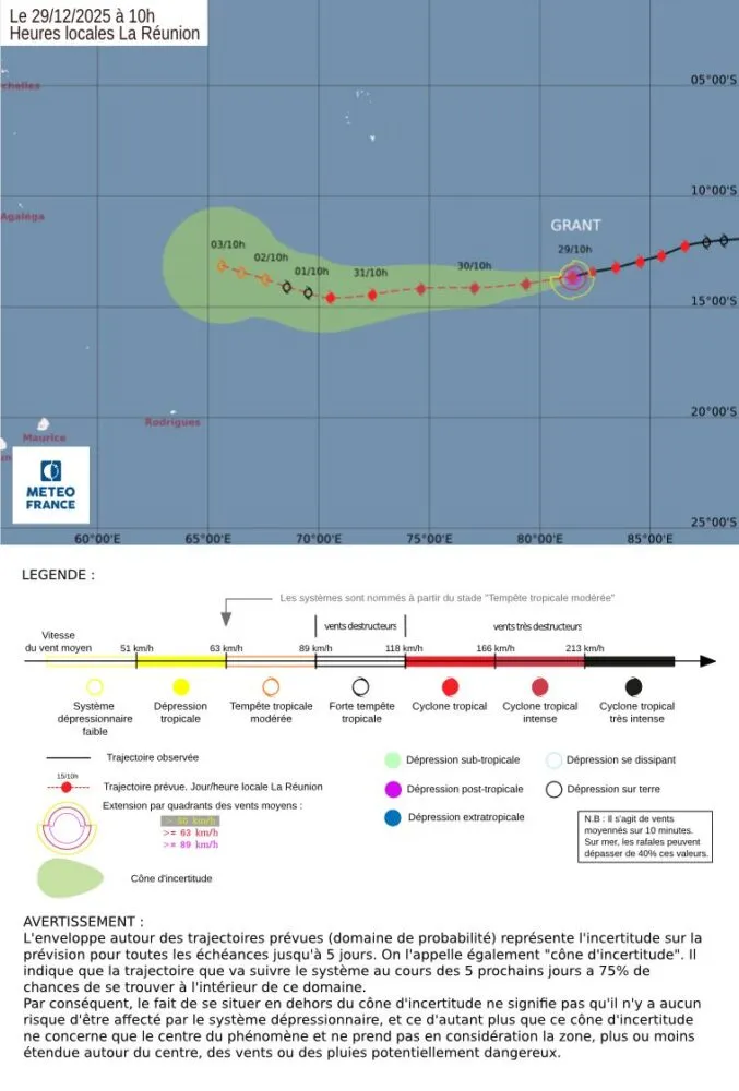 À ce stade, aucune influence de GRANT n’est attendue sur La Réunion et Mayotte au cours des cinq prochains jours. Les services météorologiques restent toutefois prudents : au-delà de cette échéance, une évolution vers les Mascareignes ne peut être totalement exclue, mais les incertitudes restent trop importantes pour anticiper un impact éventuel.
