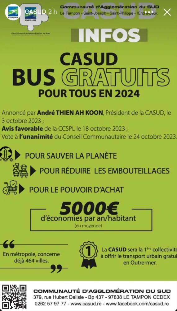 Grâce à cette excellente gestion de la CASUD, André Thien Ah Koon a pu, ce mardi, -entre autres mesures- annoncer la gratuité totale des transports en commun du réseau CARSUD de la CASUD dès 2024, à l’occasion de la mise en place de la nouvelle délégation de service public de transport.