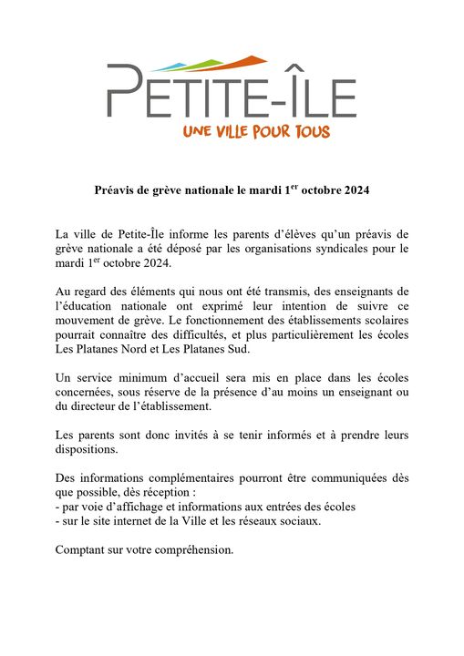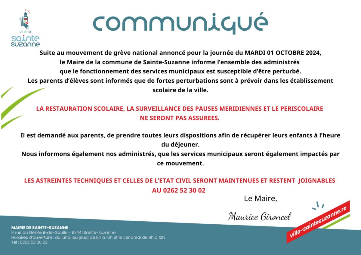 La ville de Saint-Joseph informe les parents d’élèves de l’ensemble des écoles, qu’en raison du mouvement de grève prévu le mardi 1er octobre 2024, les services de restauration scolaire, de surveillance, d’entretien et de garderie ne pourront être assurés.