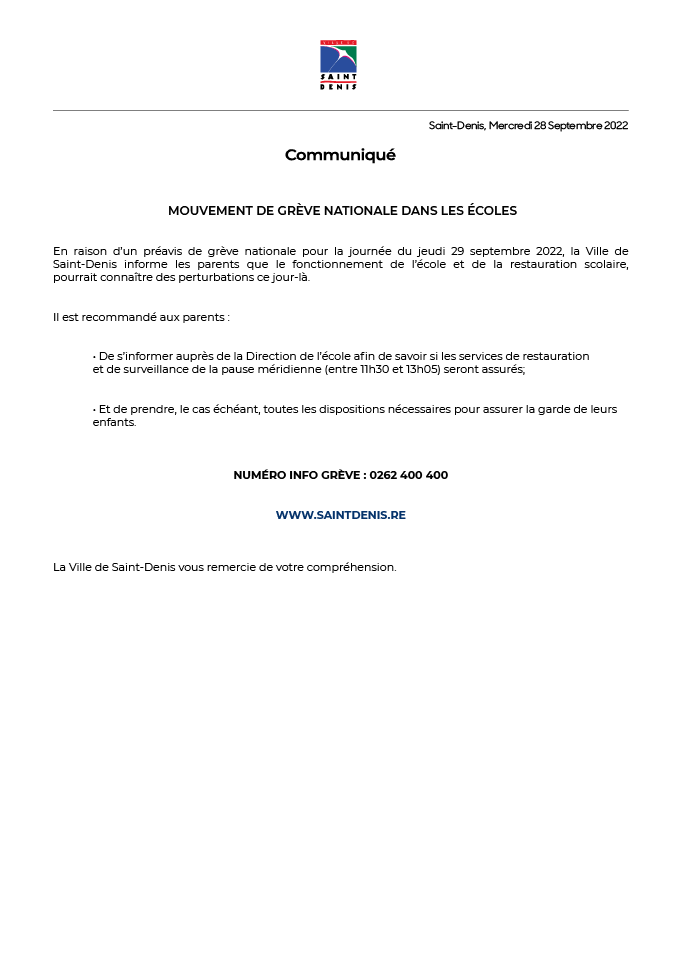 En raison du mouvement de grève nationale des agents de la fonction publique territoriale annoncé pour le jeudi 29 septembre 2022, nous informons les parents d’élèves que le service minimum d’accueil, les services de restauration, de surveillance de la pause méridienne et de garderie de fin de journée pourraient ne pas être assurés dans les écoles de Le Port à cette date.