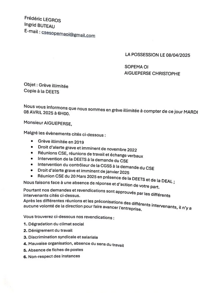 Depuis ce mardi 8 avril 2025 à 6h, les salariés de SOPEMA OI sont entrés en grève illimitée sur le site de La Possession (1 rue Mahatma Gandhi). Cette mobilisation fait suite à une « série d’alertes restées sans réponse de la part de la direction », selon les représentants syndicaux.