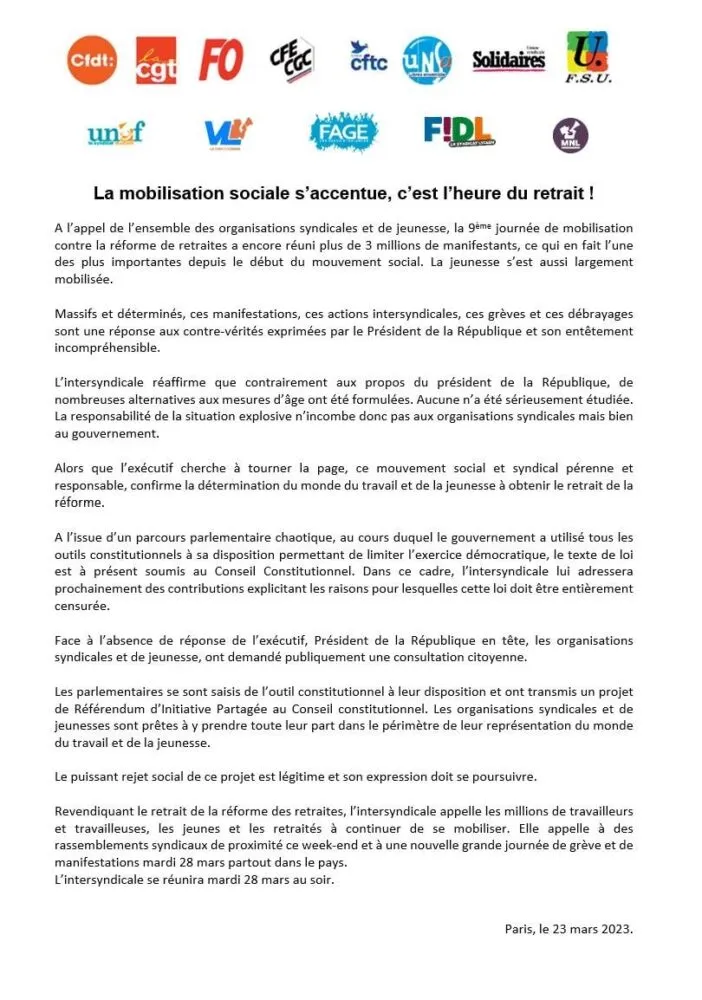 L’intersyndicale s’est réunie dans la soirée de ce jeudi 23 mars pour annoncer la tenue d’une nouvelle de journée de mobilisation le mardi 28 mars 2023. La dixième journée de mobilisation contre la réforme des retraites se tiendra donc mardi prochain, 24 heures après le retour des élèves réunionnais en classe, et donc une nouvelle journée de grève qui va s’annoncer  très difficile pour les automobilistes de notre île.