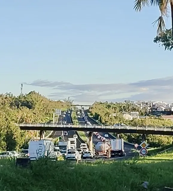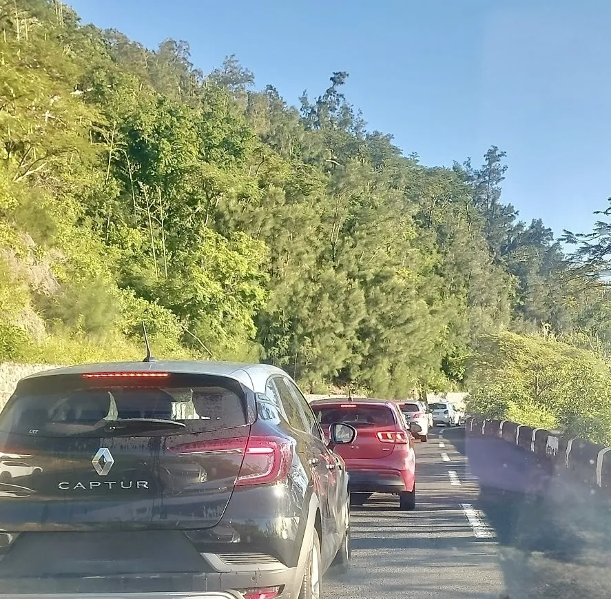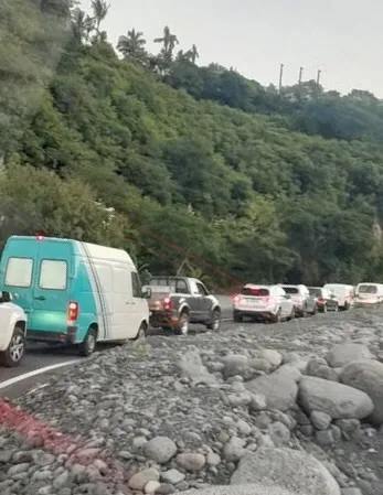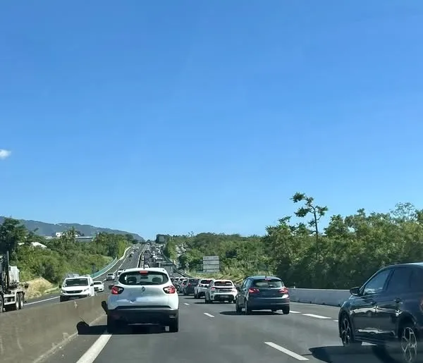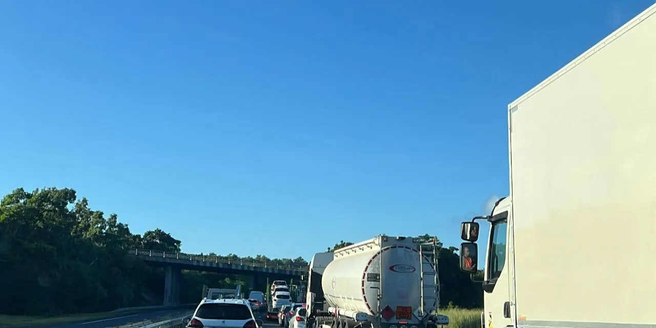 Les 4 voies de Saint-Pierre sont embouteillées dans les deux sens en raison d’un barrage filtrant. Vidéo : Mickaël Verbar.