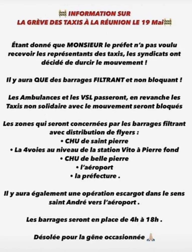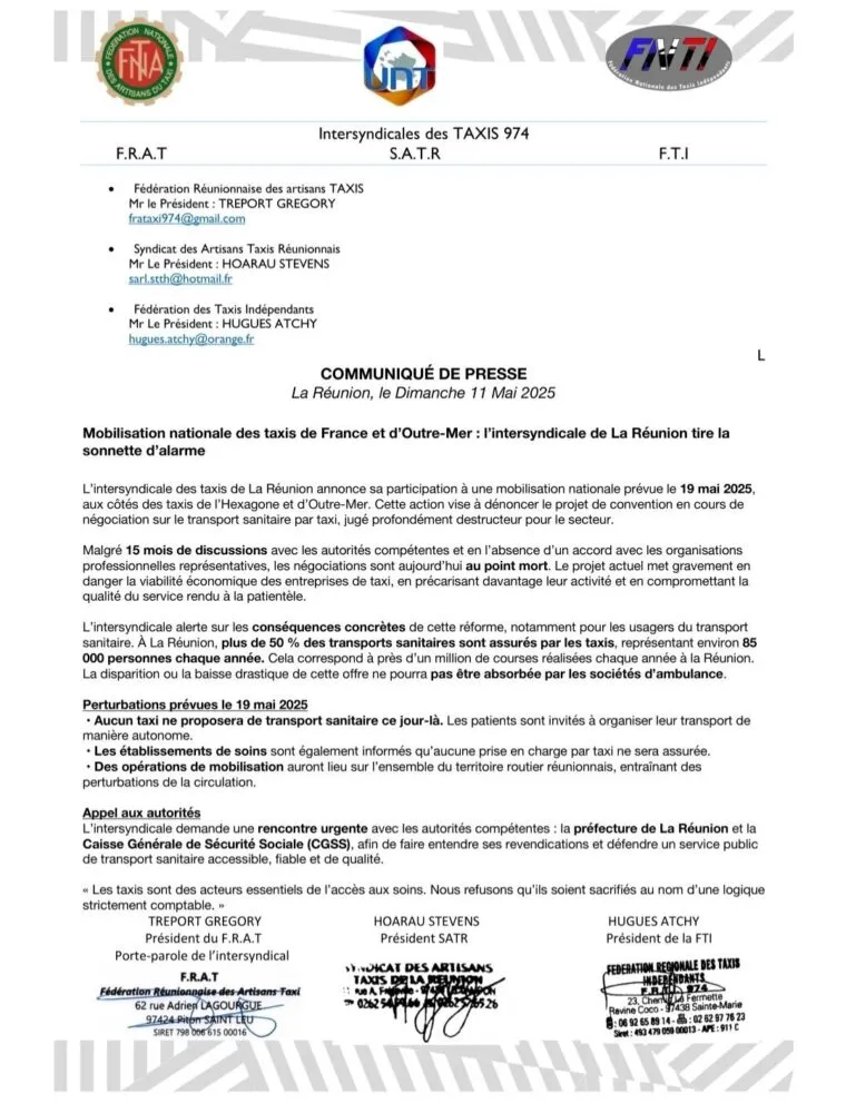 Voici le communiqué de l’intersyndicale des taxis de La Réunion sur cette grève qui s’annonce illimitée.
