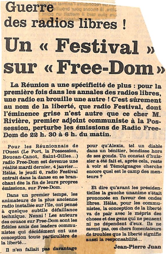 1983 Guerre des radios libres : Radio Festival brouille Free Dom par La Rédaction 31 mars 1983 1 min de lecture Ne manquez pas toute l’actualité de La Réunion ! Abonnez-vous à la newsletter de Free Dom ! Valider Partager Facebook Twitter Pinterest Linkedin Whatsapp Reddit Email Vous pourriez être intéressé par 10 décembre 1983 Une pub qui termine ces trois années d’existence 31 août 1983 Camille Sudre : « Le but poursuivi par Radio Free Dom : ne jamais se prendre au sérieux et ouvrir l’antenne à tous ceux qui veulent s’exprimer, sans aucune exclusive » 2 juillet 1983 Corneil Domitile gagne le concours de la chanson organisé par Radio Free Dom La Rédaction Laisser un commentaire Annuler la réponseYour email address will not be published. Enregistrer mon nom, mon e-mail et mon site dans le navigateur pour mon prochain commentaire. Current ye@r * Leave this field empty Article précédent Régionales : Radio Free Dom dans la bataille… Pour rire ! Article suivant Radio Free Dom, une radio qui ne se prend pas au sérieux Articles récents... Hommage à Johnny Hallyday sur Free Dom 2 ce 5 décembre Mardi 30 décembre 2025 – Météo, éphéméride et horoscope du jour Saint-Joseph : découverte de 2337 plants de cannabis, arrestation de 2 individus Point sur le réseau routier départemental, 29 décembre à 16H30 Suicide sur le pont de la Rivière d’Abord : importante mobilisation des secours et des forces de l’ordre Radier submergé à Ilet Furcy : la route de Cilaos fermée à la circulation cette nuit Fortes pluies : appel à la plus grande prudence à Saint-Paul Saint-Gilles-les-Bains : une route impraticable, les riverains montent au créneau (VIDEOS) Très grands excès de vitesse : un délit passible de prison depuis le 29 décembre 2025 Fermeture temporaire du sentier de la Canalisation des Orangers (cirque de Mafate)