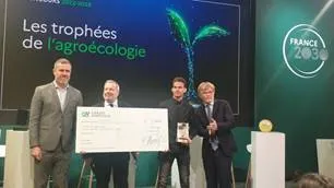 Gaby Benicio, sommelière d’ Aponom (Vailhan) et Cyril Kocher, sommelier de Thierry Schwartz (Obernai) reçoivent le prix de la sommellerie des mains de Serge Dubs (l’Auberge de l’Ill).