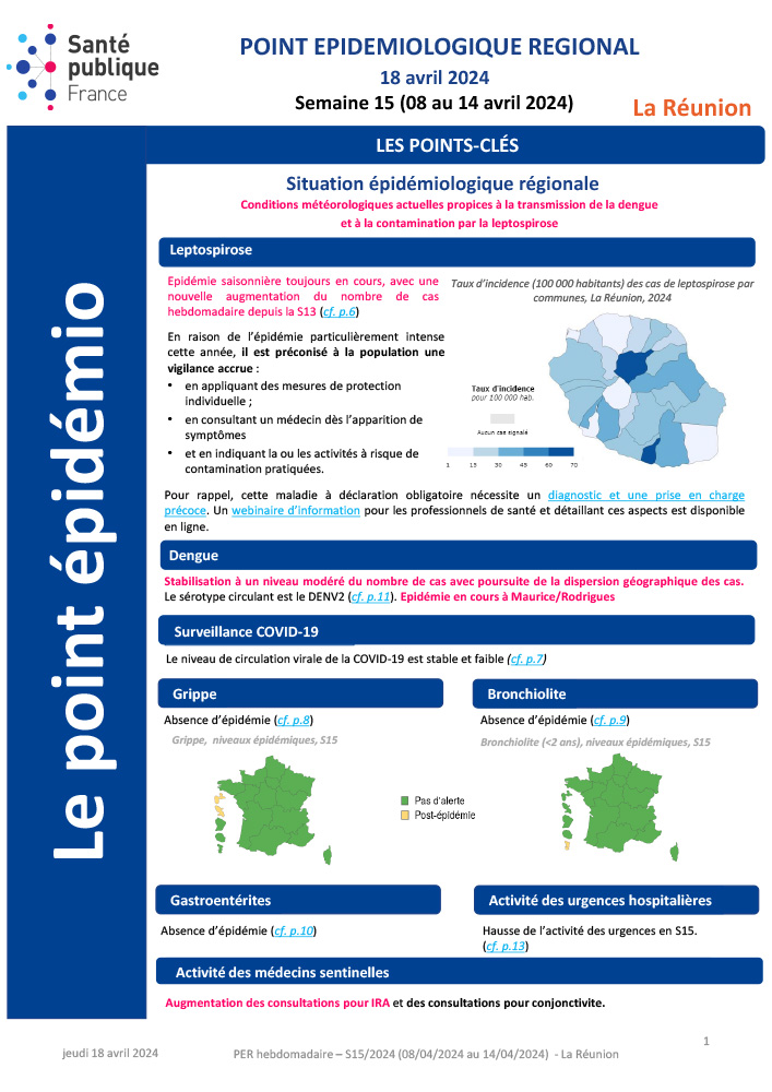 · Leptospirose : Nouveau pic épidémique en S13, de nouveaux cas sont attendus dans les semaines qui arrivent en attendant l’hiver austral et des conditions climatiques rendant moins favorable la survie de la bactéries dans l’eau douce et milieux / sols humides.