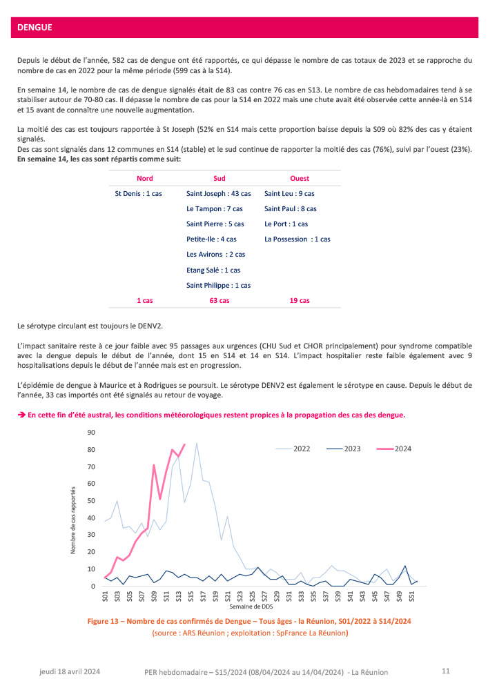 · Dengue : 582 cas ont été rapportés depuis le début de l’année, ce qui dépasse le nombre de cas totaux de 2023 et se rapproche du nombre de cas en 2022 pour la même période.