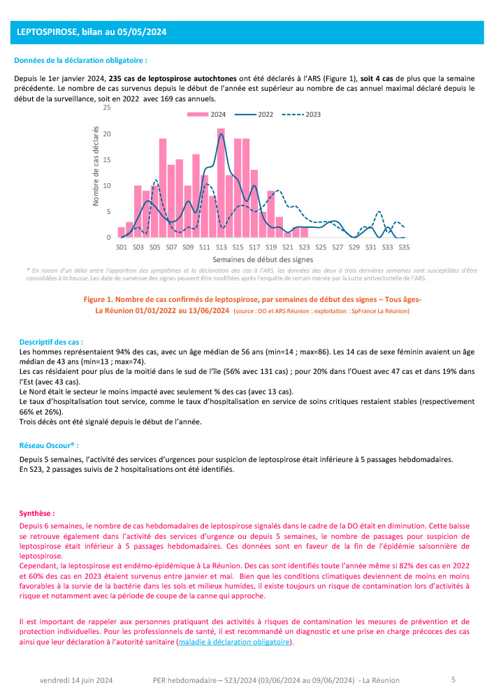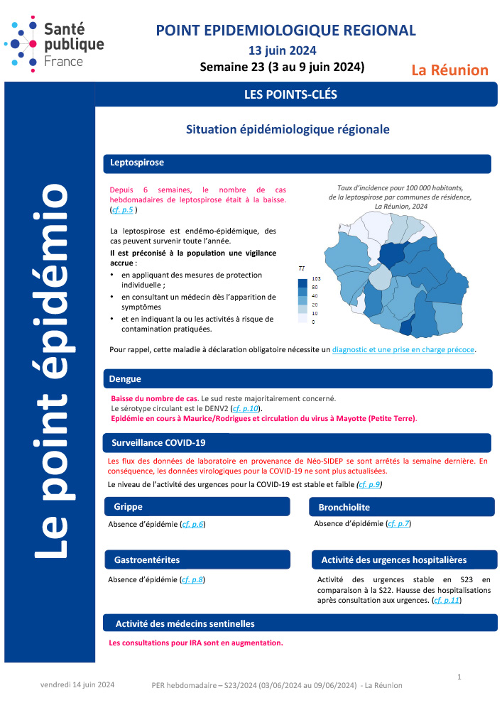 Cette semaine, le point épidémiologique régional présente plusieurs évolutions notables. Depuis six semaines consécutives, le nombre de cas hebdomadaires de leptospirose est en diminution, marquant une tendance favorable pour cette maladie. Parallèlement, le nombre de cas de dengue est également en baisse, bien que le sud de la région reste majoritairement touché par cette maladie.