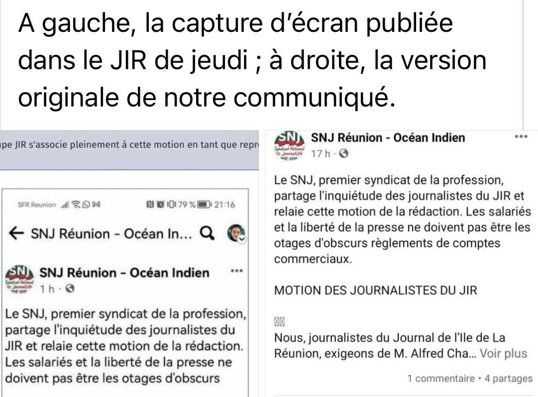 Il y a également la guéguerre Tillier-Chane Pane concernant le JIR. Suis tombé sur un post Facebook d’Edouard Marchal, journaliste, responsable du SNJ (Syndicat national des journalistes) Réunion-océan Indien. Voici ce qu’écrit le SNJ : « en soutenant les salariés du JIR, pris en otages dans la bataille de chiffonniers qui oppose leur patron à l’imprimeur Alfred Chane Pane, le SNJ Réunion océan Indien défend l’emploi et le pluralisme mais n’entend pas se laisser abuser par le duo Tillier-Planchenault. Ces deux-là ne peuvent en aucun cas se présenter comme des martyrs de la censure tant ils se sont toujours illustrés comme les fossoyeurs de l’éthique journalistique en tordant les lignes éditoriales au gré des financeurs potentiels. Ils sont connus pour censurer, de leurs postes de direction, les papiers des journalistes qui ne vont pas dans le sens de leurs intérêts. Ce que le SNJ a déjà eu l’occasion de dénoncer. Ces mauvaises habitudes sont tellement ancrées dans leur façon de faire qu’ils n’ont pu s’empêcher de caviarder la courte introduction que le SNJ a publiée pour relayer la motion des journalistes du JIR. Leurs grands ciseaux ont coupé l’allusion aux règlements de comptes commerciaux qui sont à l’origine de toute cette lamentable affaire.