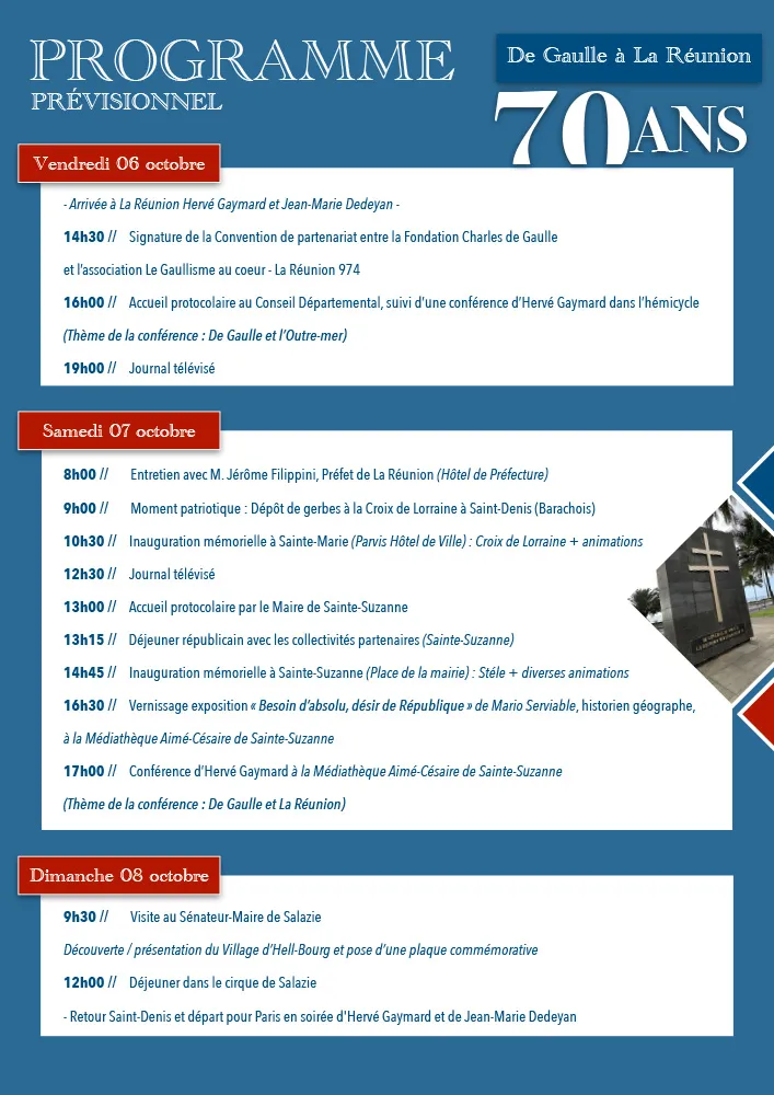 L’association « Le Gaullisme au Cœur – La Réunion 974 » prépare activement la commémoration du 70ème anniversaire de la première visite du Général de Gaulle à La Réunion, qui se tiendra ce week-end, du 6 au 8 octobre.