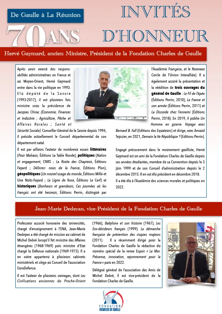Cet événement sera sous la présidence de Monsieur Hervé GAYMARD, ancien ministre et Président de la Fondation Charles de Gaulle, qui sera accompagné pour cette occasion spéciale de Monsieur Jean-Marie DEDEYAN, ancien collaborateur ministériel de Michel DEBRÉ.