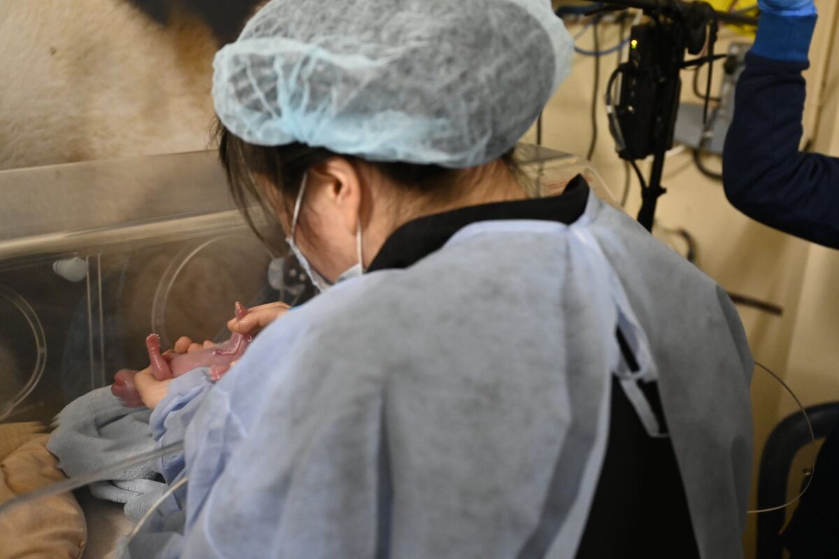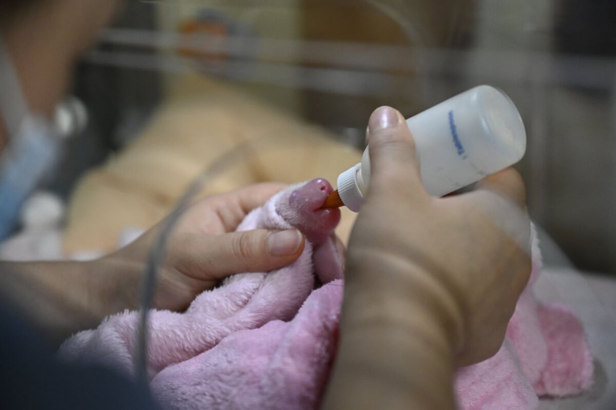 « Huan Huan prend bien soin de ses petites avec tout son instinct et son amour maternel. Toutefois, les vétérinaires et ses soigneurs lui donnent un petit coup de pouce ! Car, en effet, lors de la naissance de jumeaux, il est très fréquent que la mère s’occupe uniquement du plus fort et délaisse l’autre petit. Elle peut difficilement s’occuper des 2 bébés en même temps. Ainsi, pendant que l’un des petits est avec sa maman, l’autre est placé en couveuse. Cela permet de resserrer les liens mère/petit lorsqu’ils sont ensemble mais aussi que l’équipe animalière vérifie la bonne santé du 2e bébé quand il est mis en couveuse ! L’un d’eux a ainsi pu profiter d’un biberon de lait de Huan Huan car il avait peu tété sur elle. Les vétérinaires ont également pu prodiguer les premiers soins de cordon ombilical, les peser et s’assurer de leur bonne vivacité ! Pour récupérer le bébé panda auprès de sa maman, c’est tout un tour de passe-passe qui s’opère. C’est l’une des expertes de la base de Chengdu, venue tout spécialement au ZooParc pour aider les équipes de Beauval, qui se charge de cette tâche pointilleuse ! Elle détourne l’attention de Huan Huan avec une cuillère de miel puis attrape avec toute sa délicatesse et minutie le bébé panda. Il est tout de suite lové dans une couverture durant son transfert jusqu’en couveuse pour qu’il ne prenne pas froid ! Incroyable, n’est-ce pas ? « , indique le Zoo de beauval.