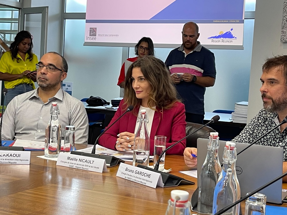 Ce jeudi matin, 8 février, Huguette Bello, présidente de la Région et Loup Wolff, directeur régional de l’INSEE, ont tenu une conférence de presse. Ils étaient entourés de certains élus de la Région (Patrick Lebreton, 1er vice-président; Wilfrid Bertile, délégué à l’élaboration du SAR et Jean-Bernard Maratchia, délégué à l’Agriculture) et de l’équipe de l’INSEE (Magali Bonnefont, Marie-Pierre Néhoua-Natiha, Patricia Puylaurent, Jamel Mekkaaoui et Bruno Garoche). Présente également : Maëlle Nicault (veste couleur bordeaux), chargée de la mise en œuvre du SAR (Schéma d’Amenagement Régional). Elle a soutenu une thèse de doctorat sur les Hauts.