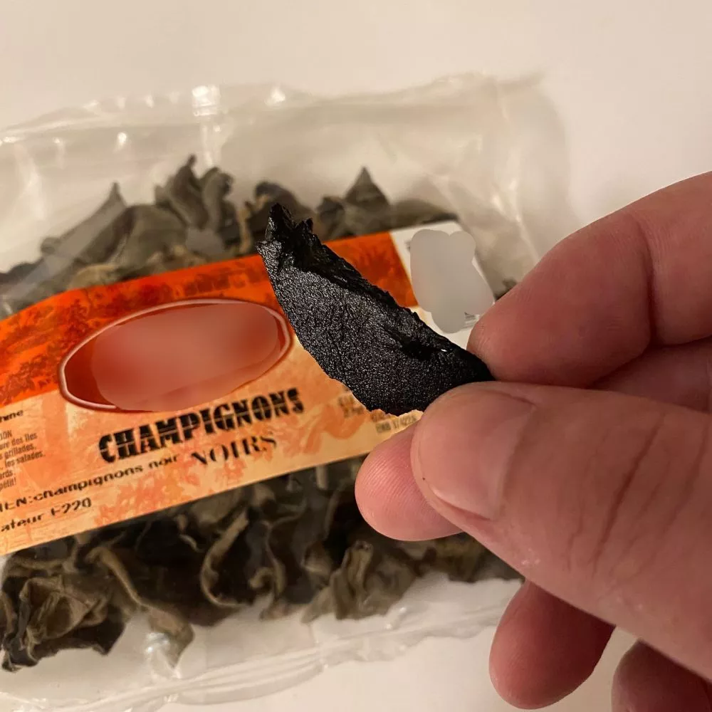 Alors qu’il s’apprêtait à faire un sauté de porc accompagné de champignons noirs plus connus sur le nom d’ « oreilles de chat » dans notre île, il a fait une terrible découverte un morceau de pneu dans le paquet qu’il s’apprêtait à réhydrater.