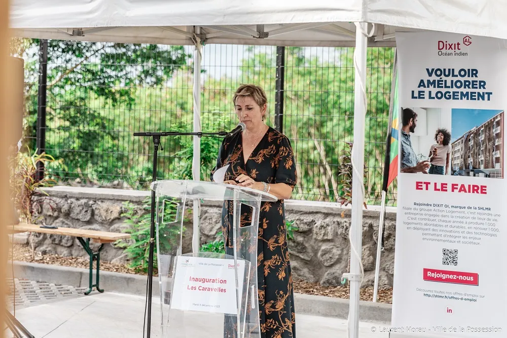 La Maire de La Possession, Vanessa Miranville, et Valérie Lenormand, Directrice Générale de la SHLMR, ont conjointement inauguré ce mardi 5 décembre 2023 la résidence « Caravelles » dans le quartier de Moulin Joli, à La Possession.