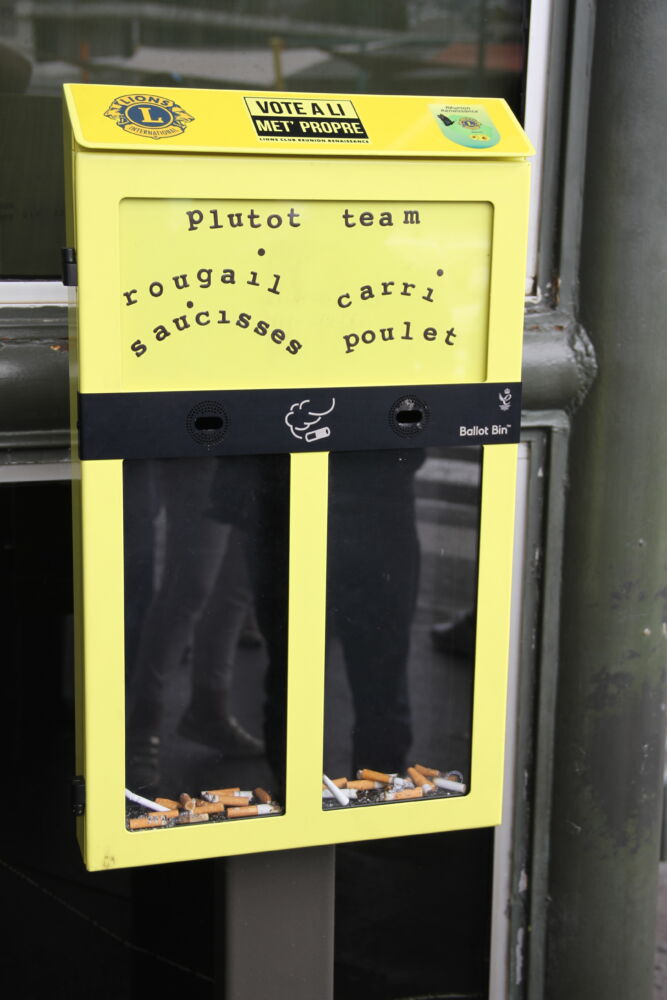 Le dispositif de collecte de mégots repose sur un concept innovant et original appelé « ballot bin », conçu en Angleterre. Ce dernier est fourni par le Lions Club Renaissance Réunion dans le cadre d’un partenariat avec l’aéroport Roland Garros. Le principe est simple : attirer l’attention des fumeurs avec humour pour les encourager à déposer leurs mégots dans une poubelle dédiée plutôt que de les jeter au sol.