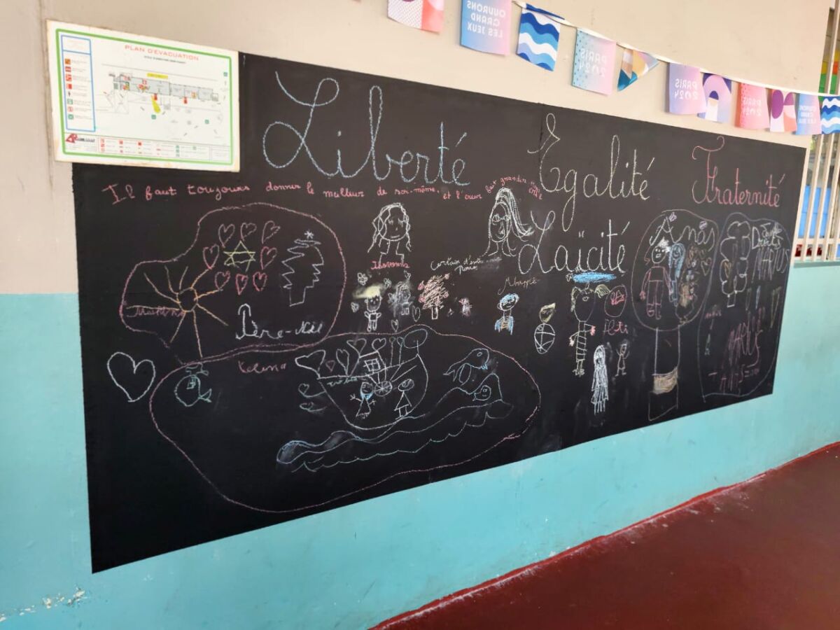 Sur ce mur noir, rappelant les tableaux d’autrefois, des mots se dessinent déjà. « Liberté, Égalité, Fraternité », gravé en grand, côtoie des esquisses à la craie. Le mot « laïcité » apparaît, lui aussi, comme une promesse. Pour autant, ce mur d’expression n’est pas un tableau ordinaire : c’est une fenêtre ouverte sur les pensées des enfants, leurs rêves, leurs émotions.