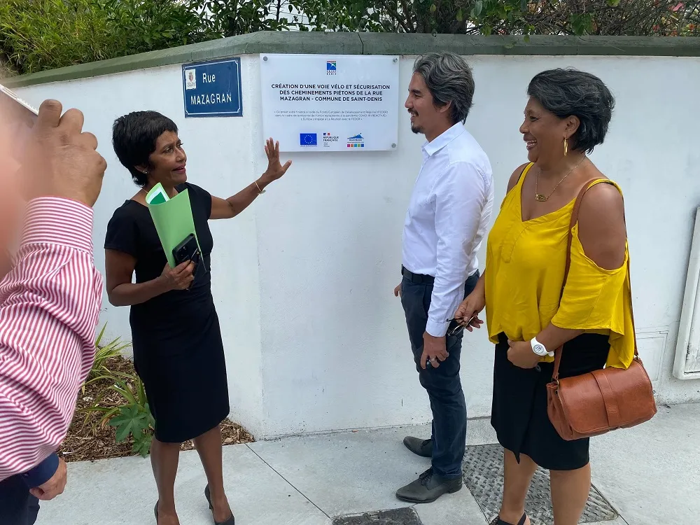 Éricka Bareigts, Maire de Saint-Denis : « On a souvent tendance à oublier que les finances publiques de Saint-Denis sont bien gérées. Elles nous permettent d’investir plus de 5 millions d’euros pour remettre les 300km de routes communales en état. La voirie nous tient à cœur mais avoir une voirie avec une approche durable encore plus. Son verdissement apporte du confort à long terme et permet de diminuer la chaleur urbaine. Saint-Denis est une ville fraternelle et inclusive, mais, c’est bien de le dire, c’est mieux de le faire. C’est pourquoi au-delà de voie, ce sont des pistes cyclables, des trottoirs plus larges et des places PMR qui ont été installés ici sur la Mazagran. »