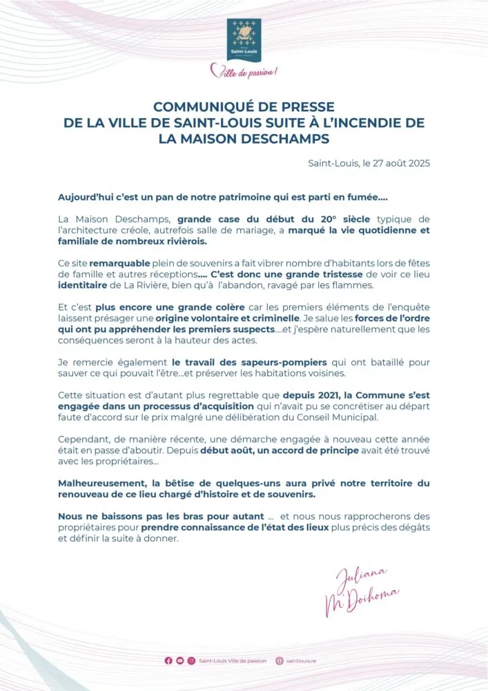 « Soutien aux soldats du feu mobilisés sur l’incendie en cours au niveau de la Maison Deschamps. La Ville suit la situation avec attention. Nous sommes d’autant plus concernés qu’une démarche est en cours afin de permettre à la collectivité de devenir propriétaire de cette grande case du début du 20ème siècle, à laquelle nous attachons une valeur patrimoniale particulière. »