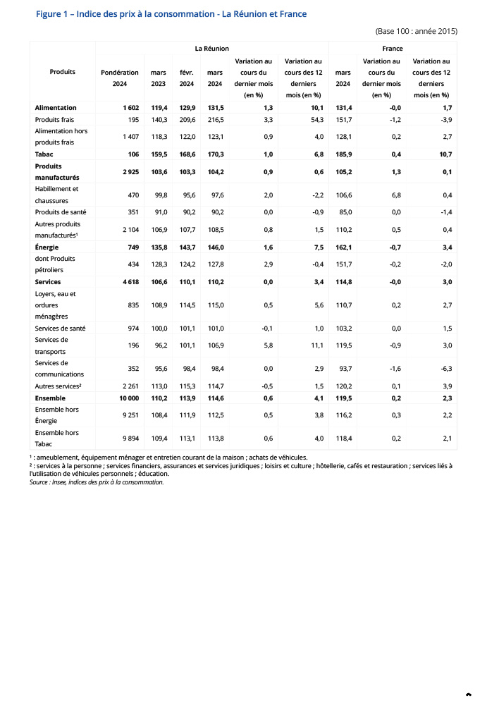 En mars 2024, l’indice des prix à la consommation poursuit sa hausse à La Réunion (+0,6 % après +0,2 % en février).