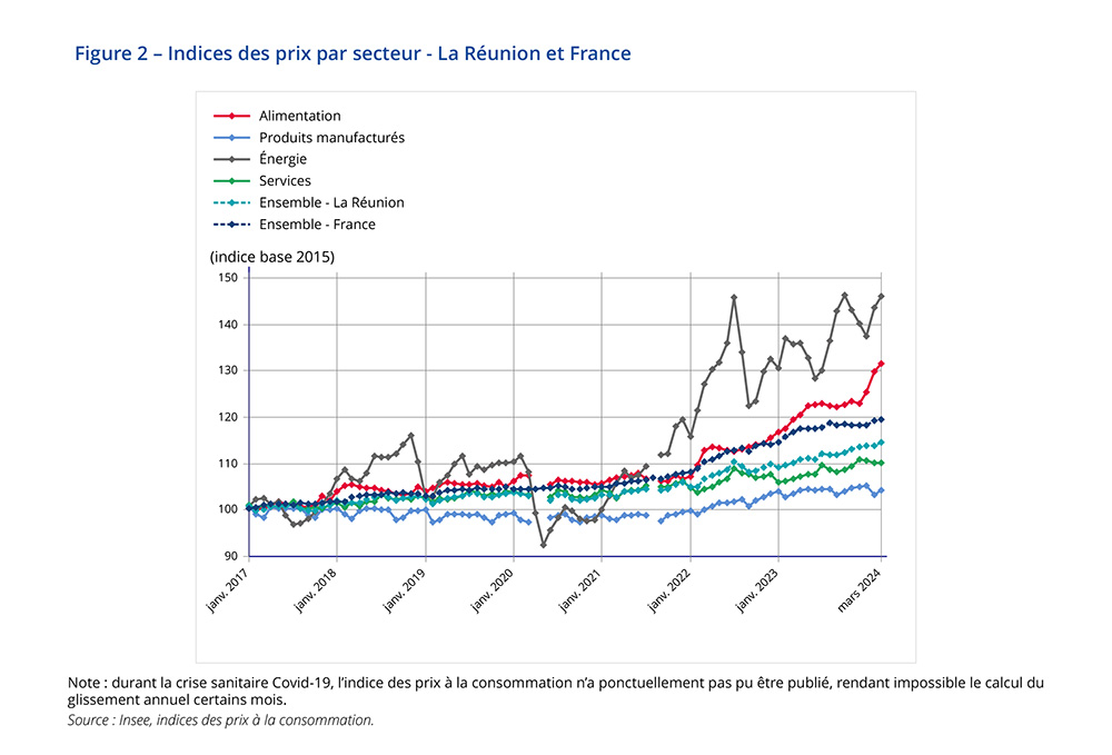 Les prix de l’alimentation croissent de 1,3 % en mars après une hausse de 3,5 % en février. Cette hausse est portée par les prix des produits frais (+3,3 %), qui avaient déjà fortement augmenté en janvier (+16,7 %) et février (+23,4 %) suite au passage du cyclone Belal. Les conséquences du cyclone se ressentent encore en mars : les prix des fruits et légumes restent élevés. Les prix de l’alimentation hors produits frais augmentent de 0,9 %.